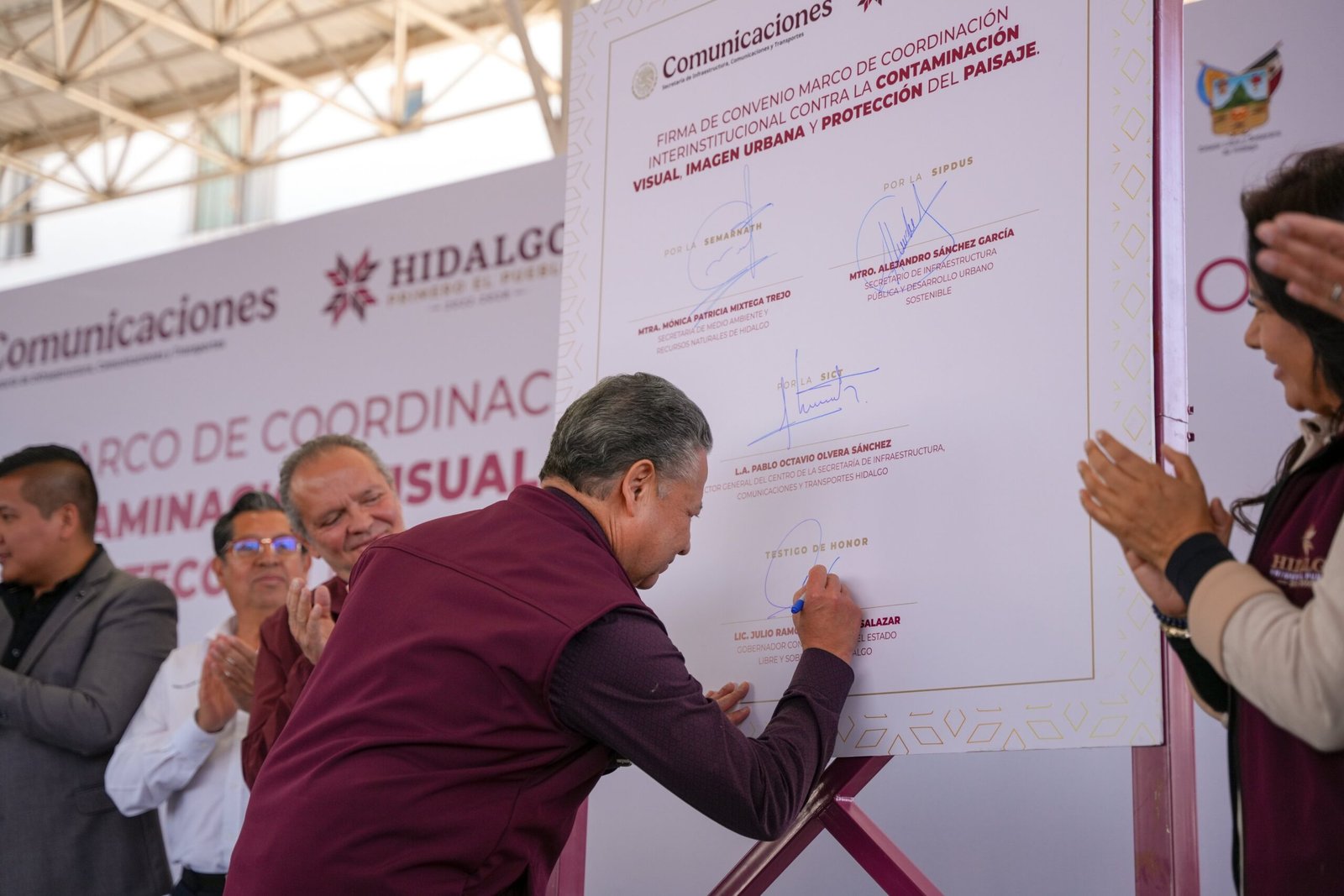 El gobernador de Hidalgo, Julio Menchaca Salazar, firmó este martes 3 de marzo el Convenio Interinstitucional para la Protección de la Imagen Urbana y el Paisaje, con el objetivo de combatir la contaminación visual y mejorar el entorno de las ciudades del estado.