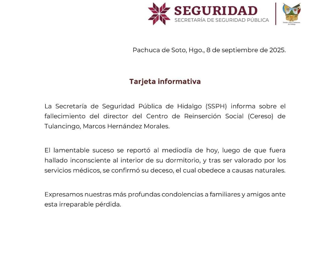 Confirma SSPH el fallecimiento de Marcos Hernández Morales, director del Cereso de Tulancingo, quien fue hallado sin vida este mediodía en el interior del penal. Autoridades informaron que el deceso obedeció a causas naturales.