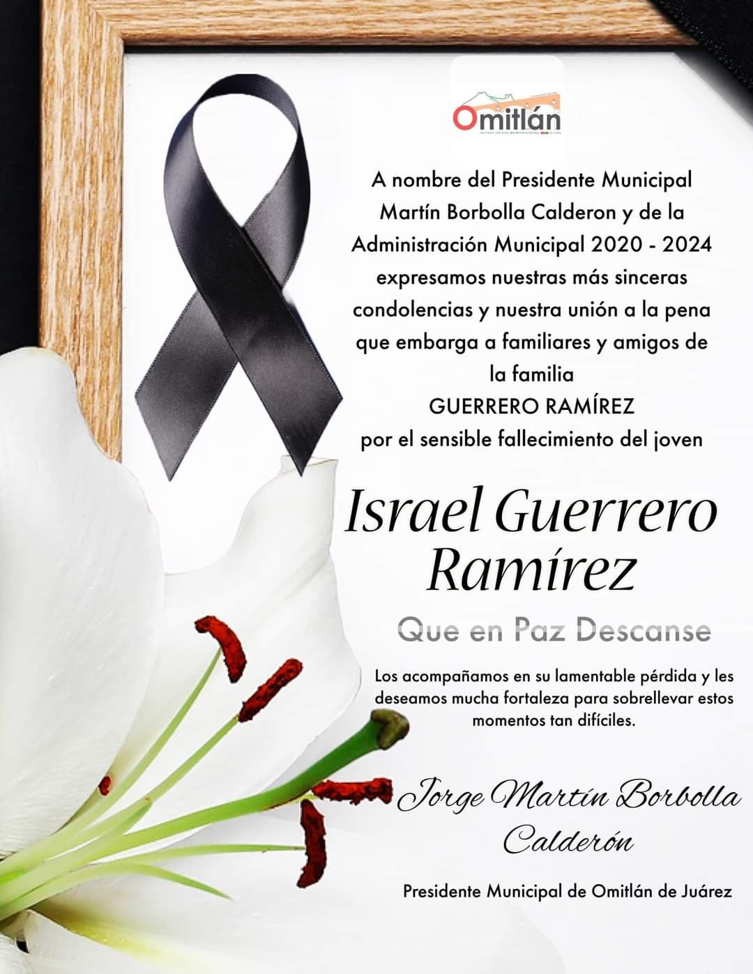 A través de una esquela, el Ayuntamiento de Omitlán y su alcalde Martín Borbolla, lamentaron la muerte de Israel Guerrero Ramírez, el único hidalguense que murió en el accidente de las obras de la nueva carretera Pachuca-Huasca.