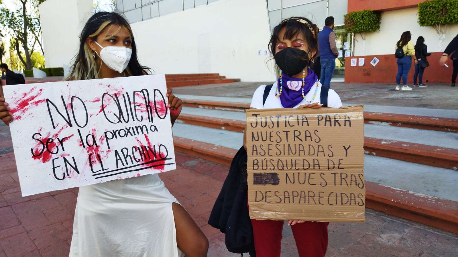 «¡Disculpen las molestias, nos están asesinando!» fue otra consigna para llamar a las personas que veían desde sus casas y negocios está marcha, que concluyó con una velada y un pase de lista de aquellas mujeres que han desaparecido en Hidalgo, que suman más de 50 de 2021 a la fecha.