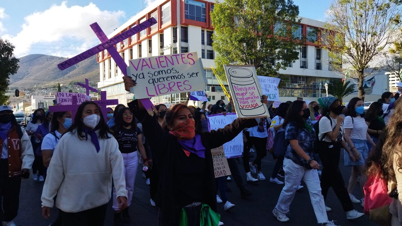Cruces con los nombres de algunas mujeres que han sido asesinadas se asomaban por las cabezas de las mujeres que caminaron por la avenida Madero, rumbo a Plaza Independencia en donde guardaron un minuto de silencio «por aquellas que ya no están».