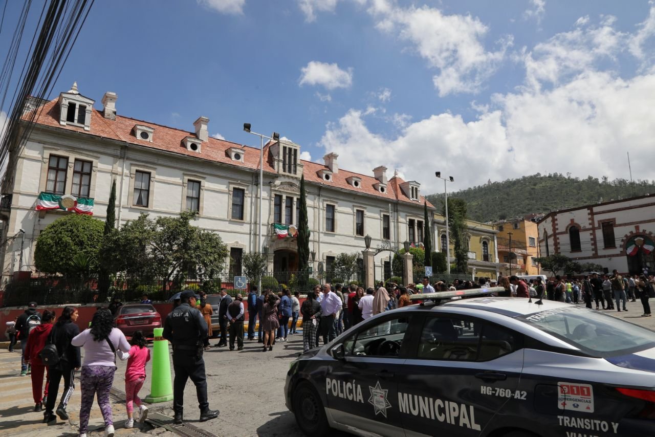 En la capital hidalguense, el Ayuntamiento municipal, encabezado por Jorge Reyes, desalojaron en un tiempo de 2.5 minutos, sin daños estructurales. Fueron evacuados 257 trabajadores, 39 visitantes, sin mujeres embarazadas, 3 infantes y 15 adultos mayores.