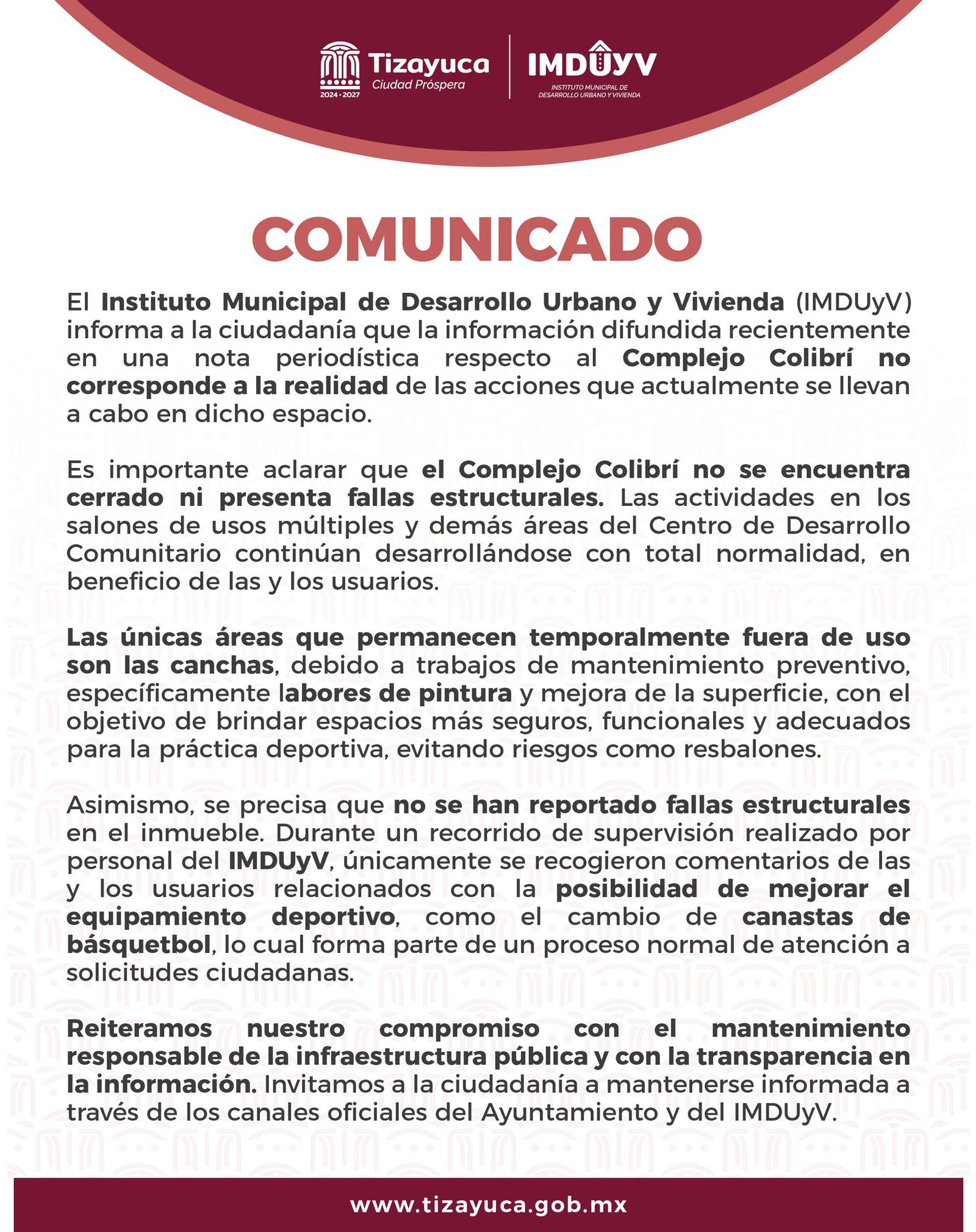 El Instituto Municipal de Desarrollo Urbano y Vivienda (IMDUyV) de Tizayuca aclaró información difundida en algunos medios de comunicación locales, en la que se aseguraba que el Complejo Colibrí se encontraba cerrado y presentaba presuntas fallas estructurales, lo cual fue desmentido de manera categórica por la dependencia municipal.