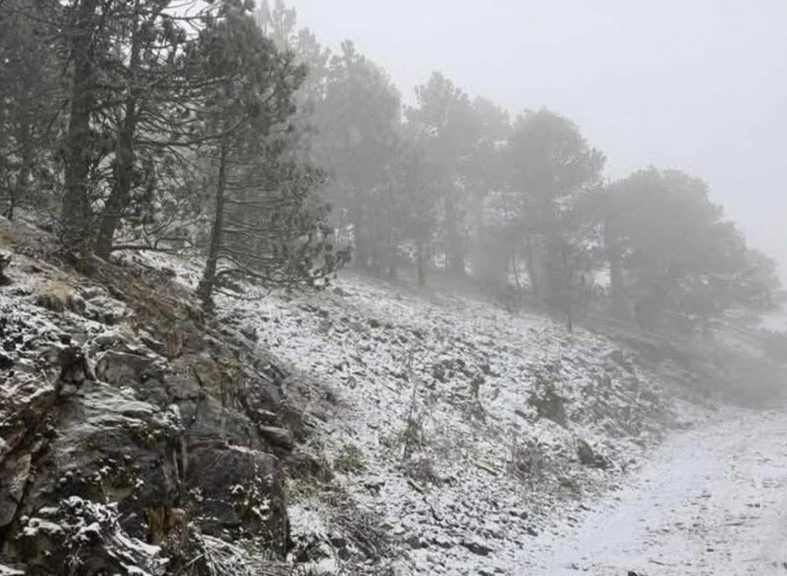 La mañana de este domingo se registró la caída de nieve en el Cerro del Potosí en el municipio de Galeana, Nuevo León.