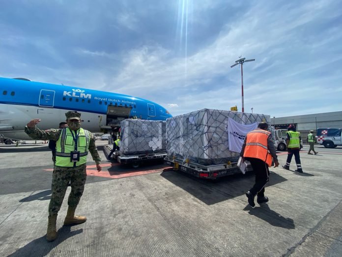 Hace unos minutos, se recibió en el Aeropuerto Internacional de la Ciudad de México el mayor cargamento de vacunas registrado para un solo día. El lote enviado desde Ámsterdam, forma parte del mecanismo Covax y comprende 2 millones 229 mil 600 dosis de AstraZeneca.