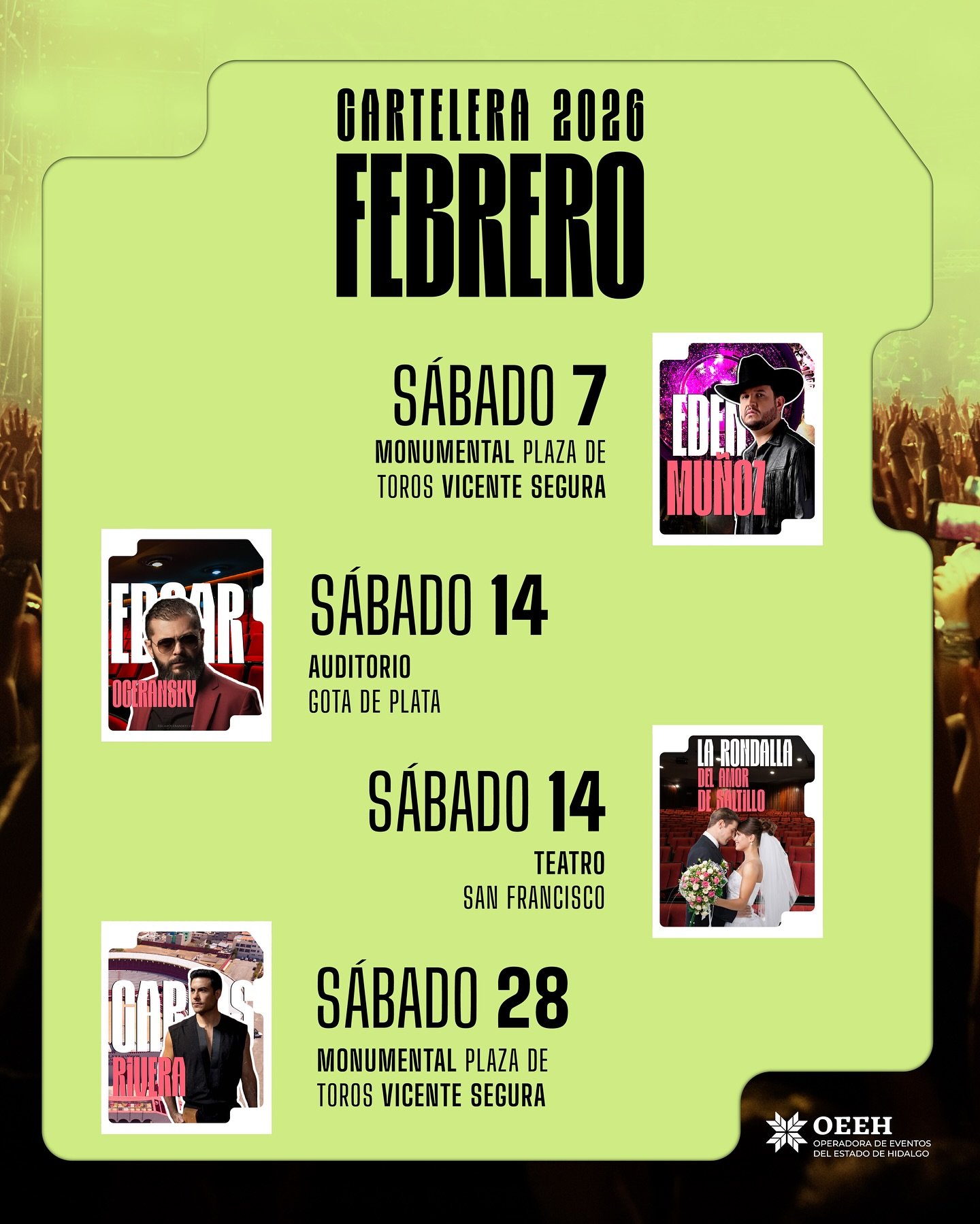Con el objetivo de fortalecer el uso de los espacios públicos destinados al entretenimiento, la Operadora de Eventos del Estado de Hidalgo (OEEH) dio a conocer la cartelera de espectáculos que se llevarán a cabo durante el mes de febrero en los recintos que administra.