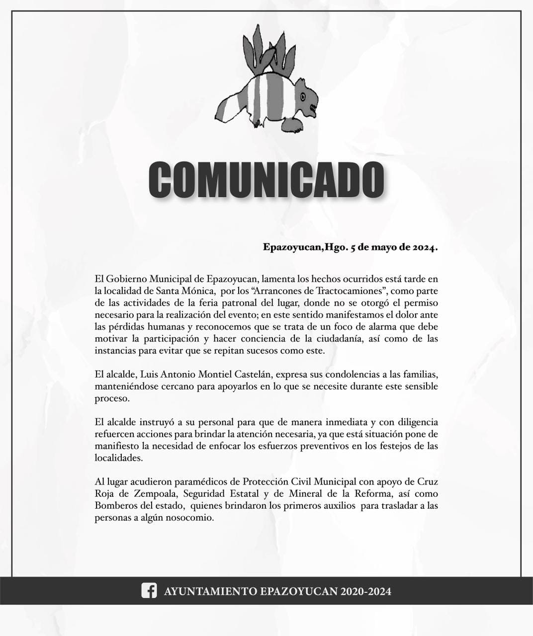 Tras el hecho ocurrido, el ayuntamiento de Epazoyucan emitió un comunicado que menciona lamentar lo que pasó, además de comprobar que ese evento no contaba con los permisos necesarios para su ejecución.