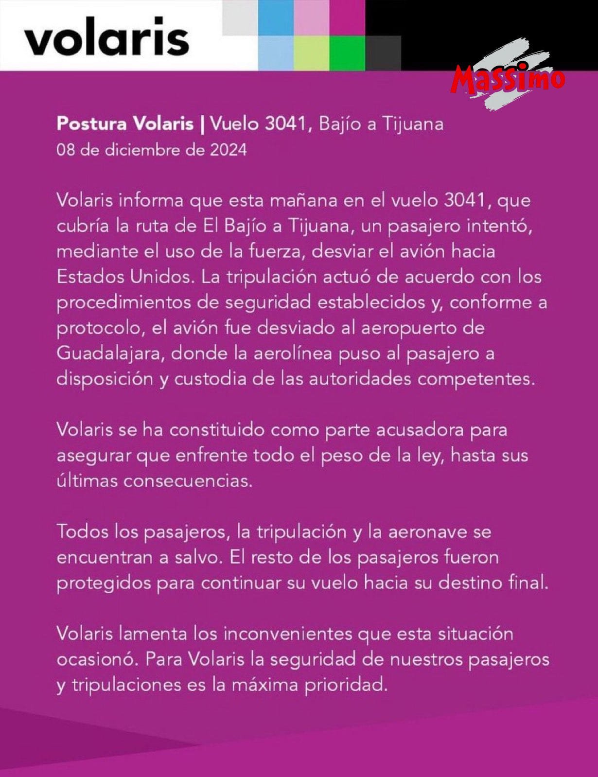 “el avión fue desviado al aeropuerto de Guadalajara, donde la aerolínea puso al pasajero a disposición y custodia de las autoridades competentes”. Se señala en un comunicado emitido por Volaris.