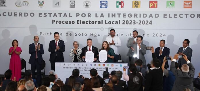 El mandatario estatal acudió a la firma del Acuerdo Estatal por la Integridad Electora en la que los representantes de los poderes Legislativo y Judicial en el estado, así como el presidente del Tribunal Electoral del Estado de Hidalgo, la Fiscalía Especializada en Delitos Electorales, el Colegio de Notarios y representantes de partidos políticos, acudieron.