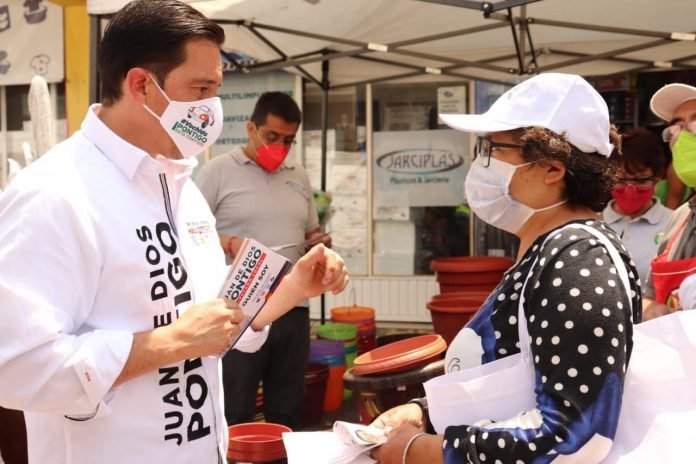 Juan de Dios Pontigo Loyola candidato a diputado local de la coalición Va por Hidalgo, que compite por el Distrito XIII Pachuca, acompañado de su compañero de fórmula, Juan Carlos Robles, recorrió el tianguis de San Cayetano, el más emblemático de esta ciudad capital, donde llevó propuestas de cómo legislar para reactivar una economía colapsada por el gobierno federal actual conocido de la 4T.