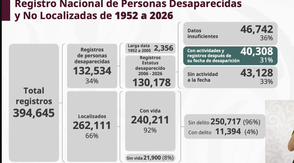 De acuerdo con la información presentada, desde la creación del Registro Nacional de Personas Desaparecidas y No Localizadas se han reportado 394 mil 645 personas desaparecidas en México. De este total, el 62% (262 mil 111) ha sido localizado.