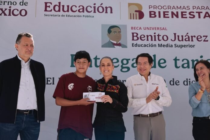 La presidenta de México, Claudia Sheinbaum Pardo, encabezó la entrega de tarjetas de la Beca Universal para la Educación Media Superior “Benito Juárez” y supervisó la construcción del Centro de Bachillerato Tecnológico Industrial y de Servicios (CBTIS) No. 304, el cual presenta un avance del 90 por ciento y estará concluido el próximo 27 de diciembre para ser inaugurado en febrero.