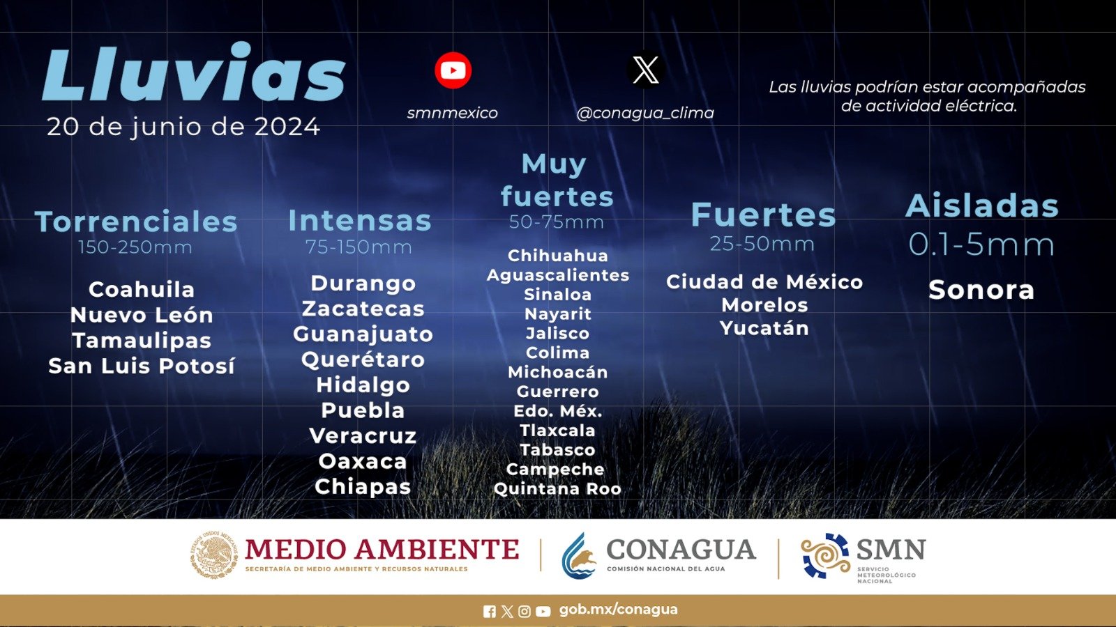 - Lluvias muy fuertes (de 50 a 75 mm): Aguascalientes, Campeche, Chihuahua, Colima, Estado de México, Guerrero, Jalisco, Michoacán, Nayarit, Quintana Roo, Sinaloa, Tabasco y Tlaxcala