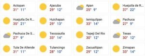 Para este lunes, se pronostican temperaturas altas para Hidalgo, esto debido a que un sistema de alta presión posicionado en niveles medios de la atmósfera mantendrá el calor de 40 a 45 grados celsius en el norte de Hidalgo.