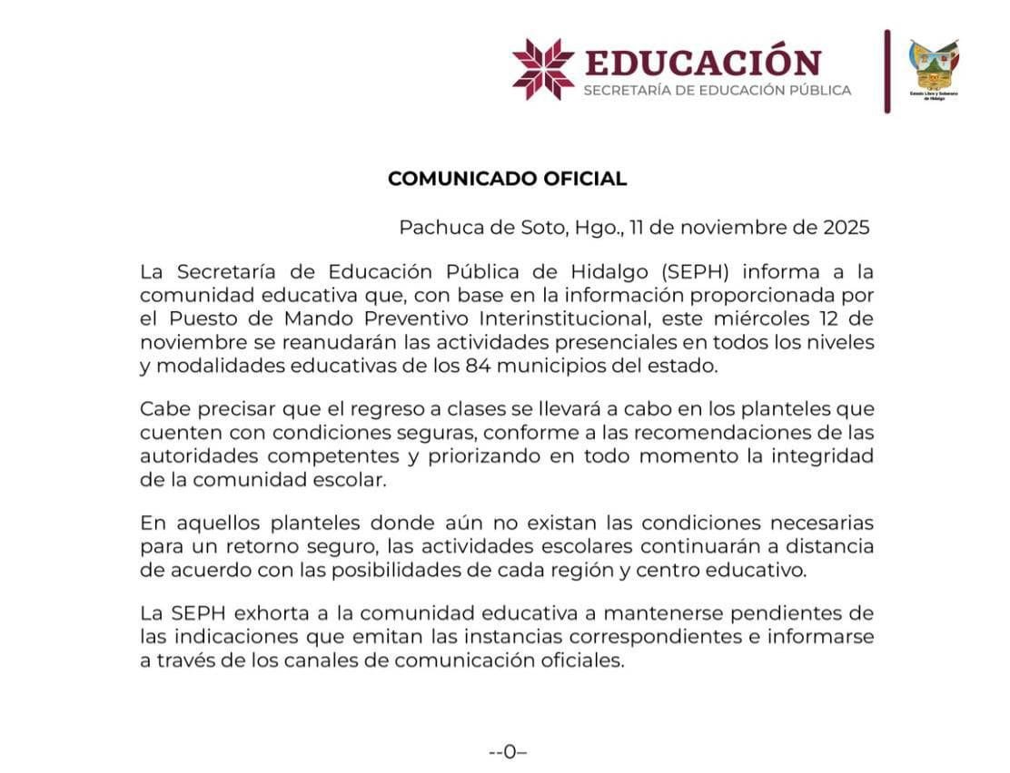 De acuerdo con el comunicado oficial emitido este 11 de noviembre, el retorno a clases se llevará a cabo únicamente en planteles que cuenten con condiciones seguras, siguiendo las recomendaciones de las autoridades competentes y priorizando la integridad de la comunidad escolar.