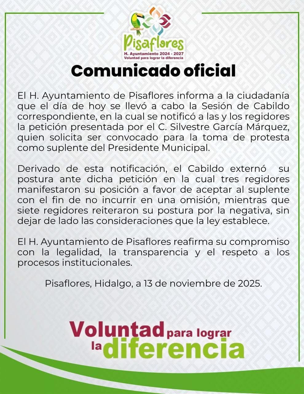 Pese a esta acción legal, el Cabildo de Pisaflores reiteró —con tres votos a favor y siete en contra— su determinación de que García no tome protesta. Esta decisión ha incrementado la tensión entre autoridades y pobladores.
