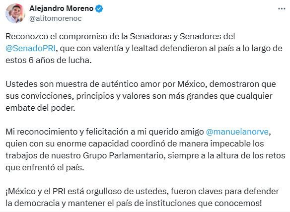 Por separado, el Presidente Alejandro Moreno reconoció el compromiso de las Senadoras y Senadores del partido, ya que a lo largo de los últimos seis años de lucha, defendieron a México con valentía y lealtad. Al igual que a Manuel Añorve por la coordinación del Grupo Parlamentario.