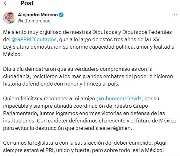 En un mensaje publicado en sus redes sociales, el líder nacional del tricolor expuso el reconocimiento a las Diputadas y Diputados Federales, donde habló del trabajo y compromiso que tienen al país.
