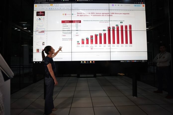 Claudia Sheinbaum también mencionó las acciones tomadas para recuperar el 8% del caudal de agua que dejó de recibir el Sistema Cutzamala debido a la falta de lluvias en los últimos años, lo que ha llevado a niveles de agua históricamente bajos en esta fuente externa de abastecimiento. Se repusieron pozos abandonados en los sistemas Lerma, Chalmita y Chiconautla, además de obtener agua adicional de una nueva fuente de abastecimiento cerca del Aeropuerto Internacional Felipe Ángeles, con un caudal de alrededor de 200 litros por segundo.