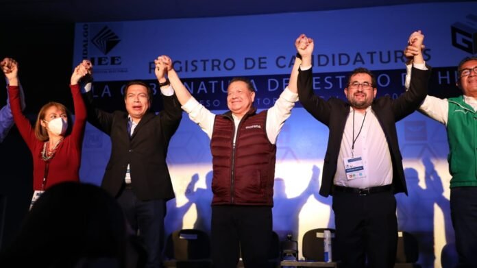 Pachuca, Hgo., a 21 de marzo de 2022.- Movimiento Regeneración Nacional (Morena), y los partidos aliados PT, PVEM y Panal, registraron a Julio Menchaca Salazar ante el Instituto Estatal Electoral de Hidalgo (IEEH), como el candidato común de “Juntos Hacemos Historia en Hidalgo”, para contender por la gubernatura del estado. Ante más de mil simpatizantes, y en presencia de la consejera presidenta Ariadna González Morales, se entregó el expediente con todos los requisitos para el caso. En su mensaje Julio Menchaca sostuvo que esta candidatura común está arropada por las dirigencias estatales y nacionales de los cuatro partidos políticos. Destacó que tal como siempre lo ha hecho, hoy cumple con la ley y todas las normas electorales. Por su parte, Mario Delgado, líder nacional de Morena, adelantó que alistan una campaña ejemplar. Apuntó que este es un movimiento legal, pacífico, que busca el cambio por la vía democrática. “Haremos una campaña basada en propuestas y también haremos un gobierno basado en la honestidad” refrendó. Delgado adelantó que no tienen duda que llegará la Cuarta Transformación a Hidalgo al igual que en los estados donde habrá elecciones este año, pues sus previsiones son ganar seis de seis es decir todas las gubernaturas que estarán en juego el 5 de junio. Al registro de Menchaca acudieron diputados y algunos senadores de la República además de líderes de diversas regiones de Hidalgo.