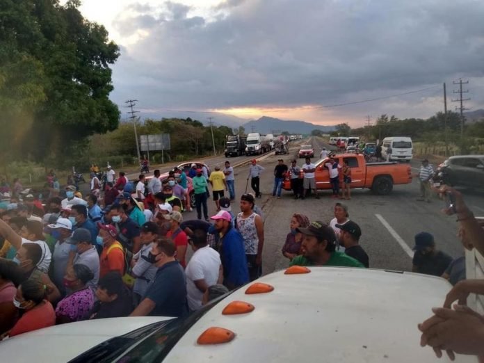 Trabajadores de las playas protestan cerrando carreteras ante las disposiciones de la Secretaría de Salud del cierre de playas por Semana Santa en Oaxaca