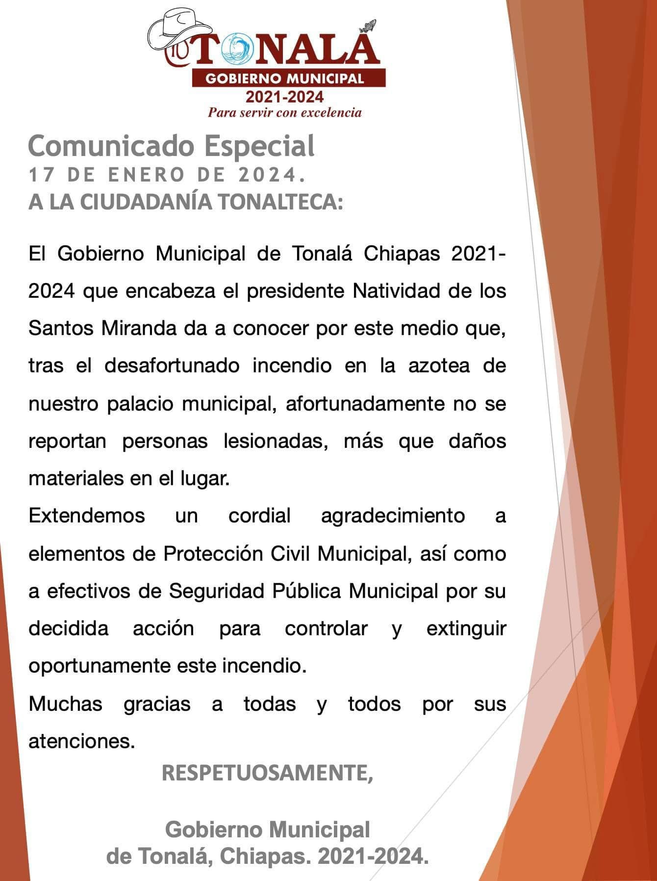 En un comunicado emitido por el Ayuntamiento de Tonalá, que encabeza el alcalde Natividad de los Santos Miranda, se confirma que tras la caída de la antena en la azotea de las oficinas municipales inició el incendio, pero que no se reportaron personas lesionadas, y solo quedaron daños materiales.