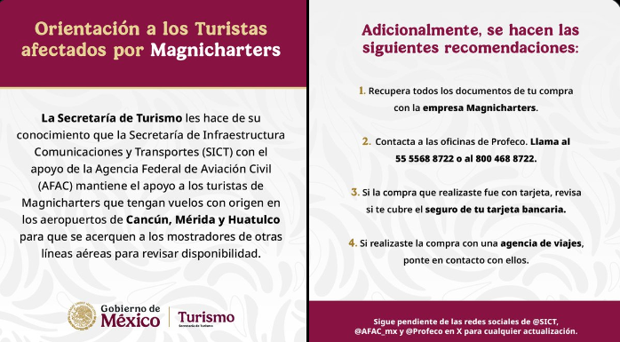 La Secretaría de Turismo (Sectur) informó que, en coordinación con autoridades federales, se brinda orientación a las y los viajeros afectados por la aerolínea Magnicharters.
