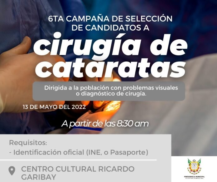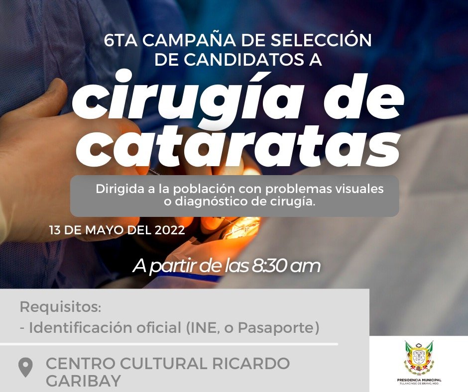 Tulancingo de Bravo, Hidalgo, 12 de mayo de 2022.- Mañana 13 de mayo se efectuará la sexta campaña de selección para candidatos a cirugía de cataratas, informó la Dirección de Sanidad del municipio.