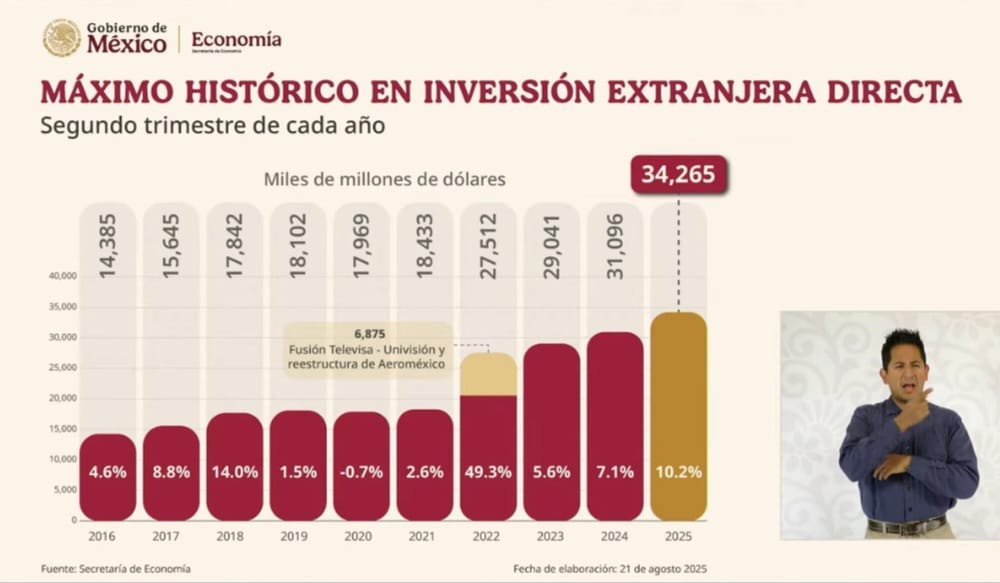 La presidenta de México, Claudia Sheinbaum, informó que durante el segundo trimestre de 2025 la inversión extranjera directa (IED) alcanzó un máximo histórico de 34 mil 265 millones de dólares, superando los 31 mil 96 millones registrados en el mismo periodo de 2024, lo que calificó como un hecho “histórico”.