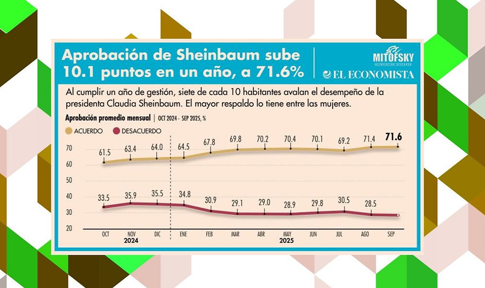 Al cumplir su primer año en la Presidencia, Claudia Sheinbaum Pardo cuenta con una aprobación del 71.6% de acuerdo con la más reciente encuesta nacional de Mitofsky de El Economista.