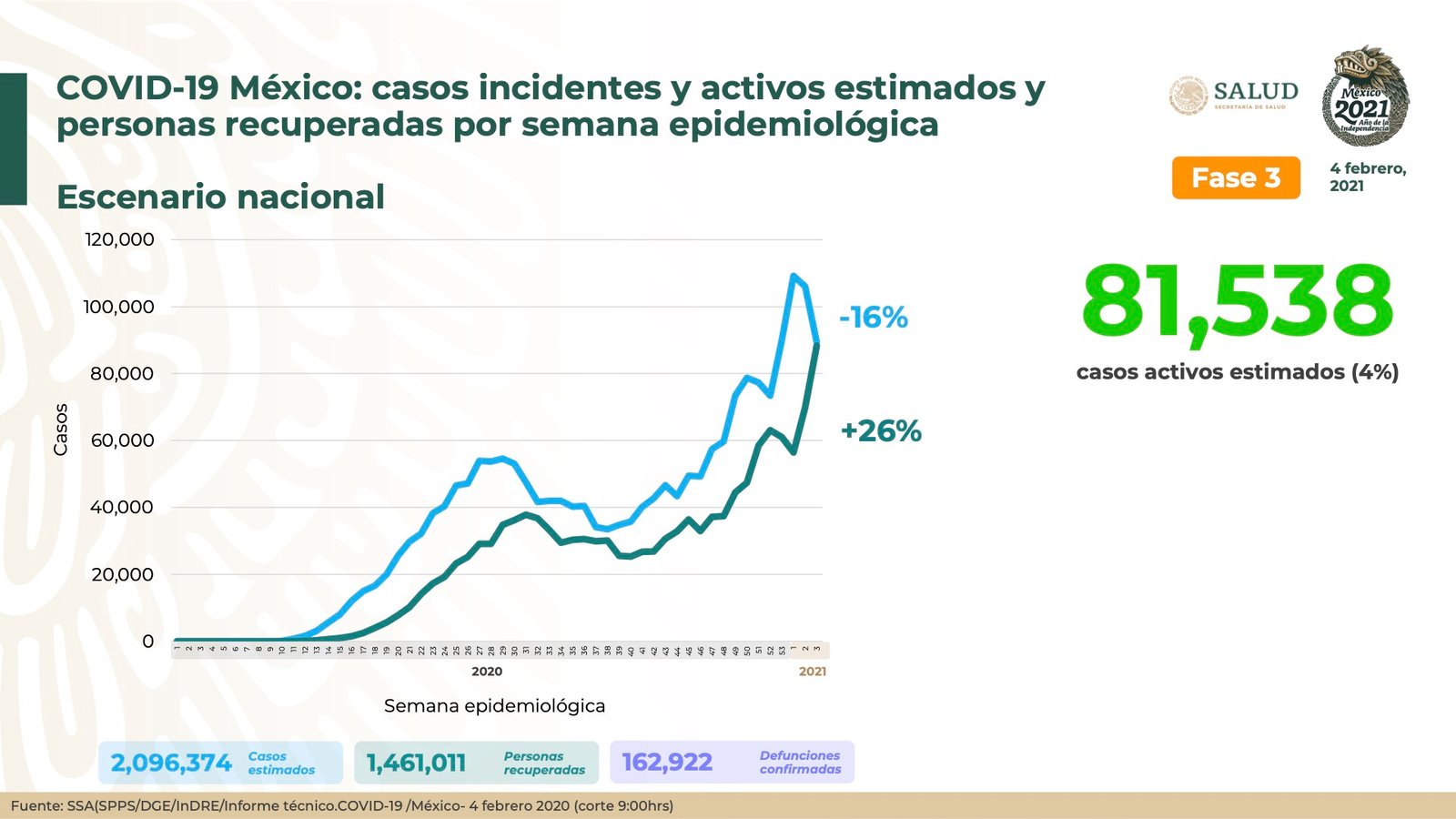 Mientras tanto, los casos activos estimados de la enfermedad COVID-19 aumentaron a 81 mil 538.