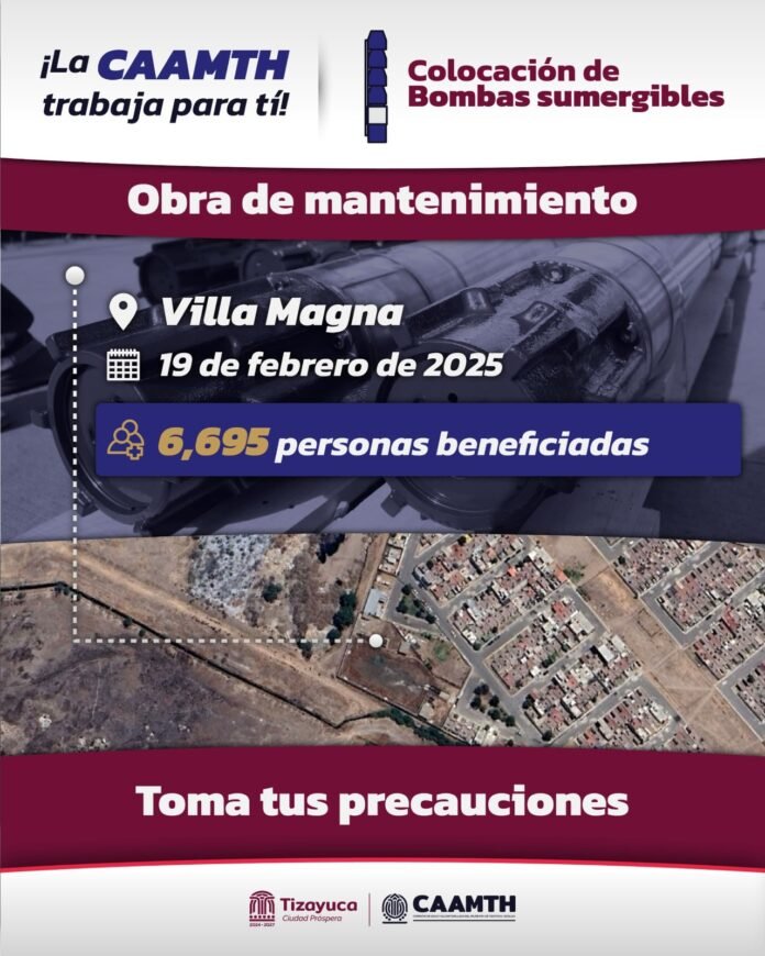 Con el objetivo de modernizar y mejorar el abastecimiento de agua potable, la Comisión de Agua y Alcantarillado del Municipio de Tizayuca Hidalgo (CAAMTH) lleva a cabo la renovación preventiva de bombas sumergibles en seis pozos del municipio.