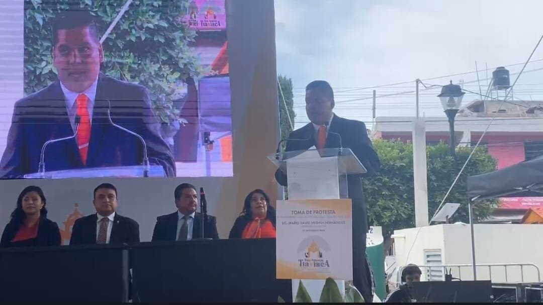 Con el lema ‘Tlaxiaca nos mueve’, este jueves, en un evento sencillo, casi austero, el emecista Mario David Medina Hernández tomo posesión como presidente municipal constitucional en la Plaza Pública de San Agustín Tlaxiaca.
