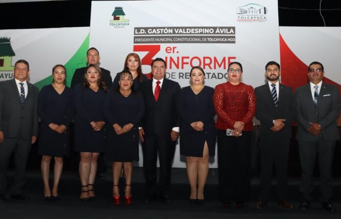 Gastón Valdespino Ávila, presidente municipal de Tolcayuca, presentó los resultados de su trabajo al frente del Ayuntamiento en el Tercer Informe de Gobierno, en el cual, frente a más de mil asistentes, detalló los beneficios y logros de su administración.