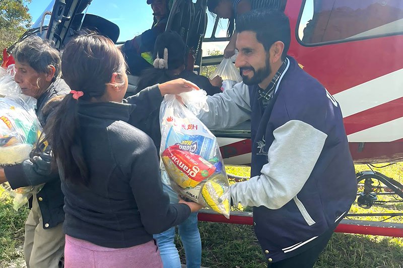 Debido a que los daños en caminos y carreteras mantienen incomunicadas varias localidades de Tianguistengo, la distribución de insumos se realizó mediante un “puente aéreo”, utilizando aeronaves habilitadas para la emergencia humanitaria que conectaron la cabecera municipal con comunidades como Chapula, San Miguel, Zacatipán, Tlacolula y Joquela, entre otras.
