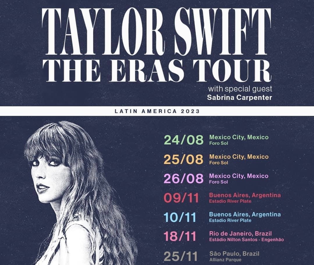 Por primera vez, Taylor actuará en México como parte de The Eras Tour, los días 24, 25, 26 y 27 de agosto de 2023, en el Foro Sol. La cantante no solamente hará un hito con la derrama generado, pues, será la primera mujer en presentar cuatro conciertos consecutivos en el recinto y con todas las entradas vendidas.