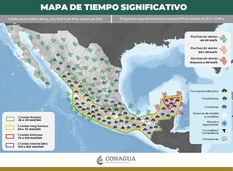 - Intervalos de chubascos (5 a 25 mm): Baja California Sur, Sonora, Sinaloa, Durango, Zacatecas, Estado de México, Ciudad de México, Morelos, Puebla, Veracruz, Tabasco, Campeche, Yucatán y Quintana Roo.