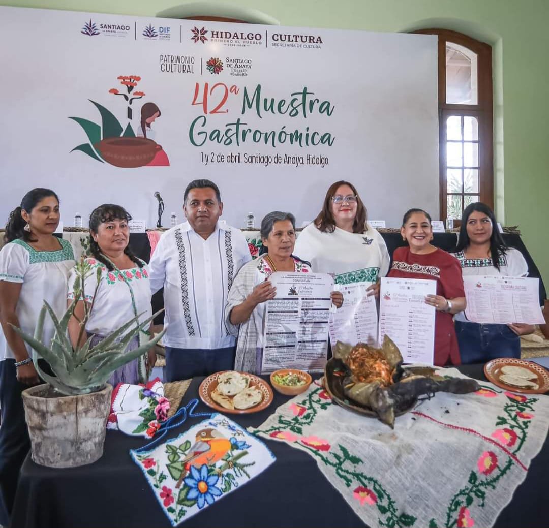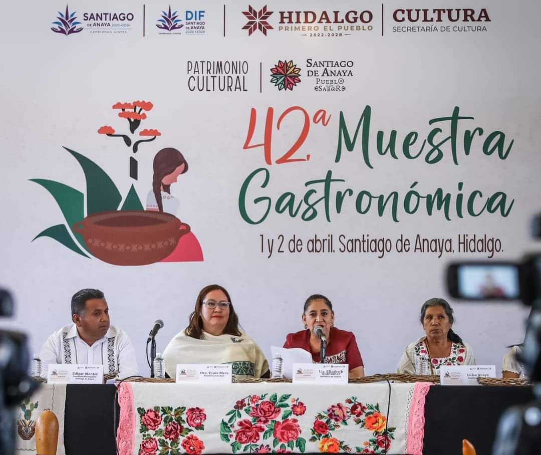 La secretaria de Turismo, del Gobierno del Estado de Hidalgo, Elizabeth Quintanar Gómez, la titular de la Secretaría de Cultura del Estado Tania Meza Escorza, así como el alcalde de Santiago de Anaya, Edigar Monter Ángeles, funcionarias municipales, cocineras y artesanas se dieron cita para dar a conocer las actividades que se desarrollarán en la edición número 42 de la Muestra Gastronómica Santiago de Anaya 2023.